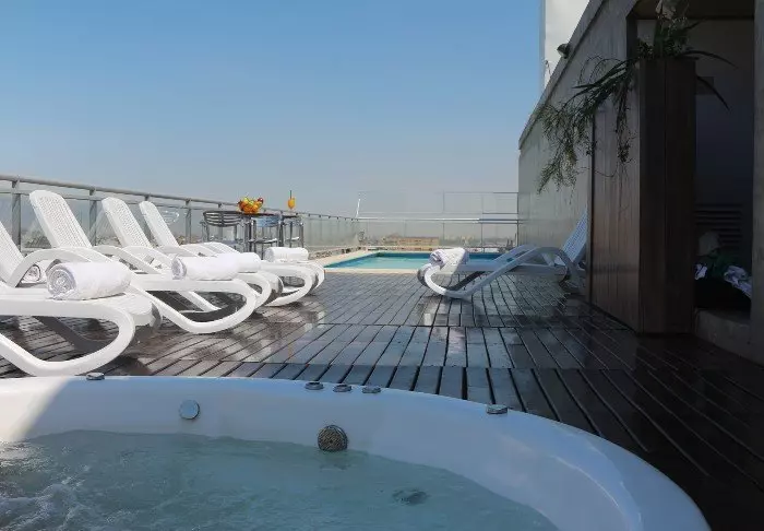 Am Dach des Gebäudes können Sie im kleinen beheizten Swimmingpool schwimmen und sich mit einem Getränk in der Hand im Whirlpool entspannen, während Sie die fantastische Aussicht auf die Stadt genießen.