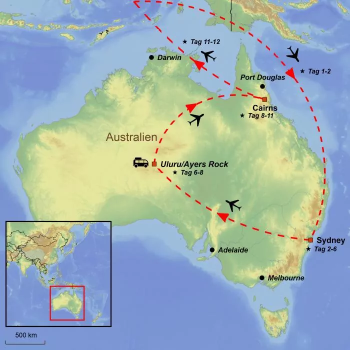 Die Kontraste können fast nicht größer sein. Von der roten Wüste mit einem mehr als 300 Millionen Jahre alten Stein zum ältesten Regenwald und zum größten Korallenriff der Welt. Australien ist ein Land der Rekorde!