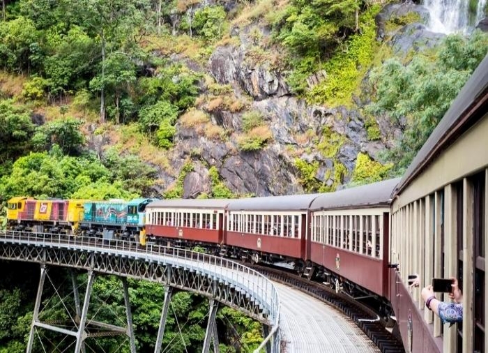 Die Zugfahrt von Cairns nach Kuranda gehört aber heute noch zu den schönsten Zugfahrten der Welt. Von Cairns schlängelt sich der 100 Jahre alte, restaurierte Zug 327 Meter über die Meeresoberfläche hinauf. 15 Tunnels durchfahren und 37 Brücken überqueren muss der Zug. Unterwegs sehen Sie sowohl den Regenwald als auch Wasserfälle. Die Zugfahrt dauert 3 Stunden. Lehnen Sie sich zurück und genießen Sie die Fahrt!