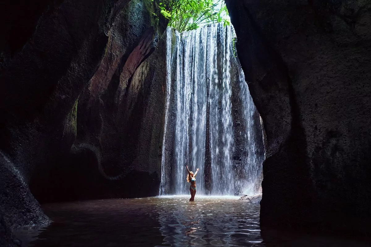 Der letzte Besuch gilt dem faszinierenden und fotogenen Wasserfall Tukad Cepung, der wie ein verstecktes Juwel mitten im Dschungel, östlich des Tempels Pura Kehen liegt. Vom Parkplatz führen Treppen in den Dschungel hinunter. Nach ca. 20 Minuten kommen Sie unten an. Sie gehen einen Weg an einem Wasserlauf entlang. Unterwegs können Sie die grüne Umgebung bestaunen. Bitte beachten Sie, dass Sie das letzte Stück Weg zum Wasserfall direkt im Wasser gehen. Denken Sie daher an gute Schuhe, die nass werden können! Beim Anblick von Tukad Cepung verschlägt es vielen die Sprache. Der Wasserfall stürzt 15 Meter zwischen den beeindruckenden Felsformationen in die Tiefe. Bei schönem Wetter sehen Sie, wie die Sonnenstrahlen in die Höhle scheinen und ein atemberaubendes Bild erzeugen.