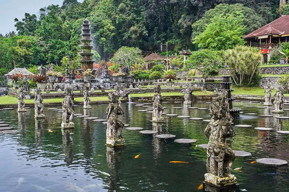 Danach werden Sie zum unglaublich schönen königlichen Wassergarten Tirta Gangga gefahren, welcher 1946 vom letzten König der Provinz Karangasem errichtet worden ist. Nach dem gewaltigen Ausbruch des Mount Agung wurde ein Großteil von Tirta Gangga zerstört. Aber der Garten wurde wiederhergestellt und ist heute wieder für die Öffentlichkeit zugänglich. Tirta Gangga ist einfach wunderschön mit seinen herrlichen Statuen, Springbrunnen und Becken mit Karpfen und atemberaubend schönen Lotusblüten. Das Mittagessen wird in einem Restaurant vor Ort direkt im Garten eingenommen.