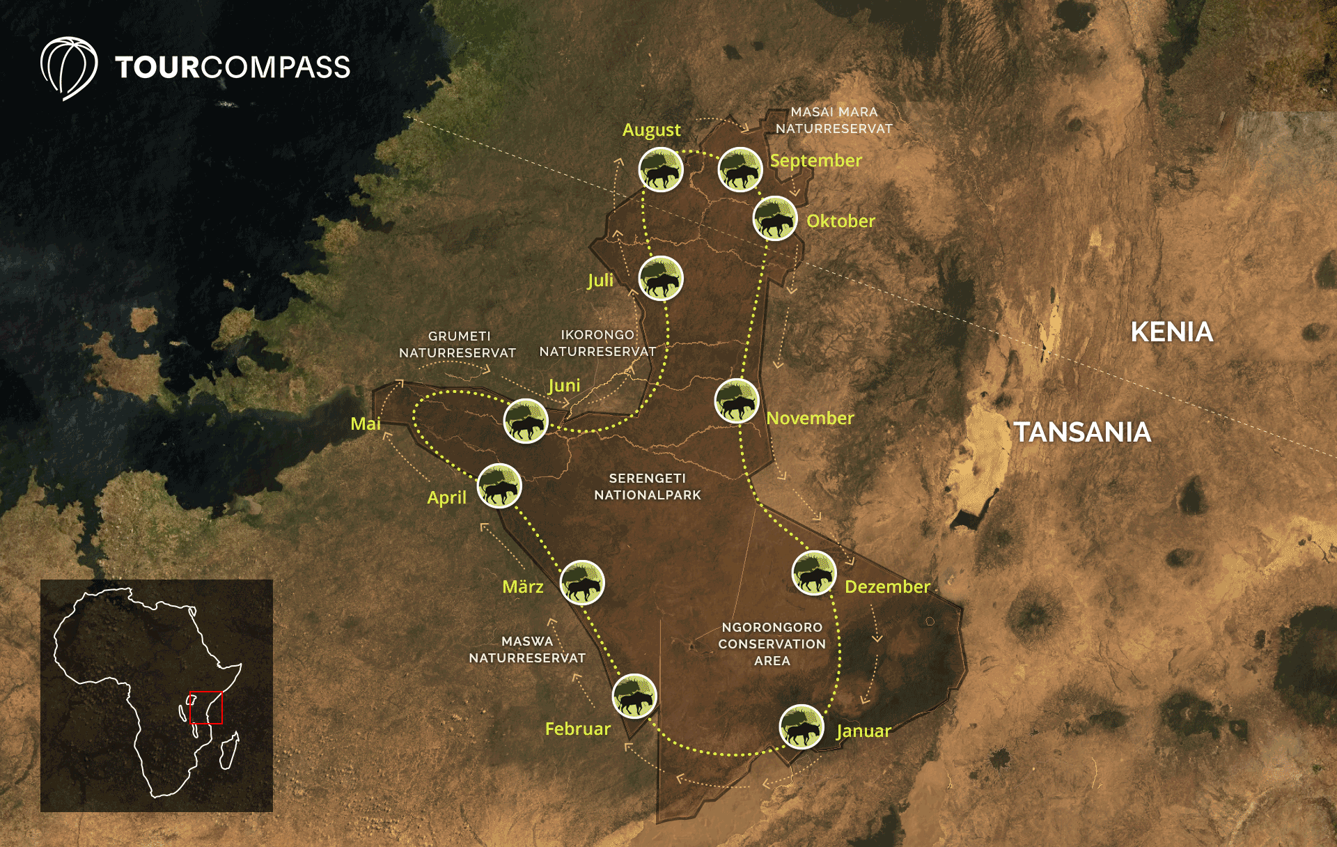 Die große Wanderung ist ein kontinuierlicher Prozess, der jedes Jahr wiederkehrt. Sie ist aber nicht nur ein jährlicher Fixpunkt, sondern etwas, dass man das ganze Jahr über an verschiedenen Gebieten entlang der Route der Tiere erleben kann.