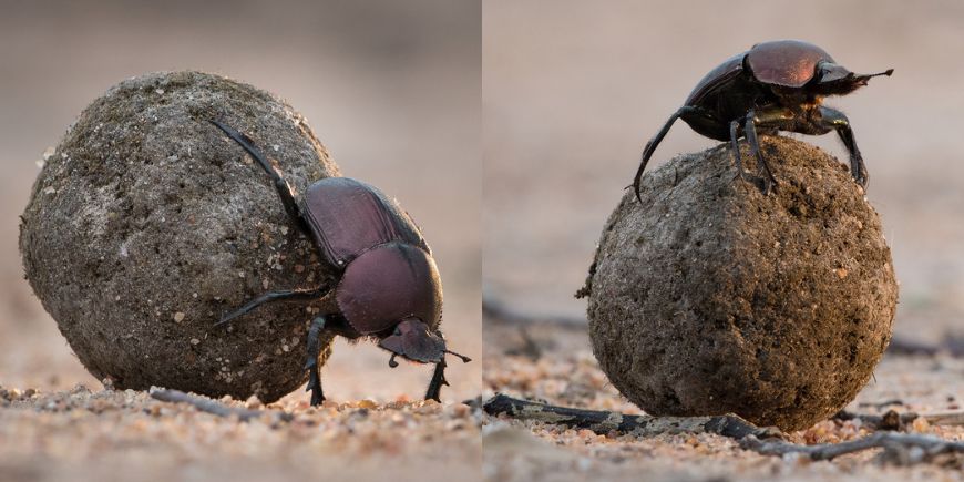 Wenn er unterwegs auf leckeren Dung stößt, formt er diesen zu einer Kugel und rollt sie vor sich her. Und als ob das noch nicht genug wäre, schiebt er die große Dungkugel mit dem Kopf nach unten und dem Hinterteil nach oben immer weiter vorwärts. Er muss oft eine Pause machen und anhalten, um nachzusehen, wo er ist und ob er in die richtige Richtung läuft. Dazu krabbelt er auf die Dungkugel und sieht sich die Sterne an. Der Mistkäfer ist somit die erste bekannte Insektenart, die die Sterne zur Orientierung nutzt.