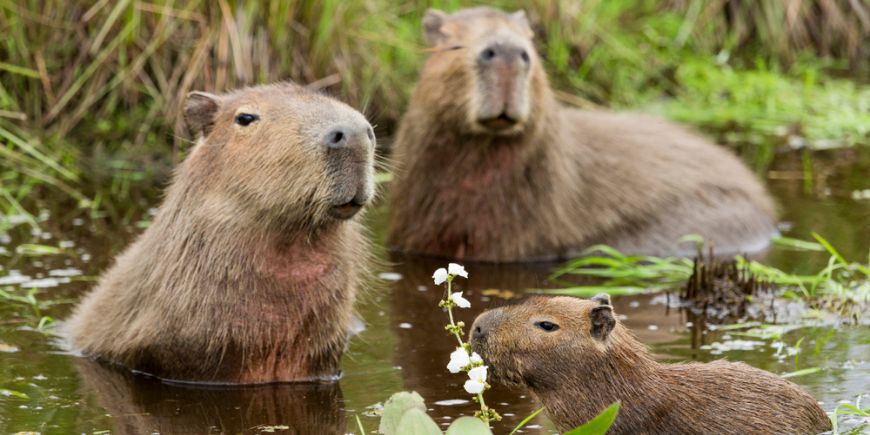 Der Capybara ist das größte Nagetier der Welt. Er wird auch Flussschwein genannt, da er sich im Wasser besonders wohlfühlt.