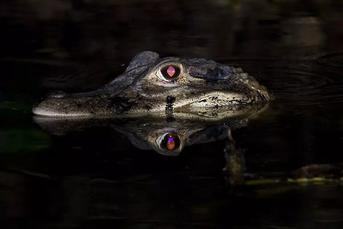 Nach dem Abendessen wartet bei Einbruch der Dunkelheit eine Nachtsafari am Fluss auf Sie. Wir wollen die Kaimane finden! Der Guide leuchtet mit seiner Taschenlampe ins Wasser. Wenn das Licht auf das Auge eines Kaimans trifft, leuchtet dieses in der Dunkelheit auf und verrät seine Position. Kaimane leben in Süd- und Mittelamerika und gehören zur Familie der Krokodile und Alligatoren.