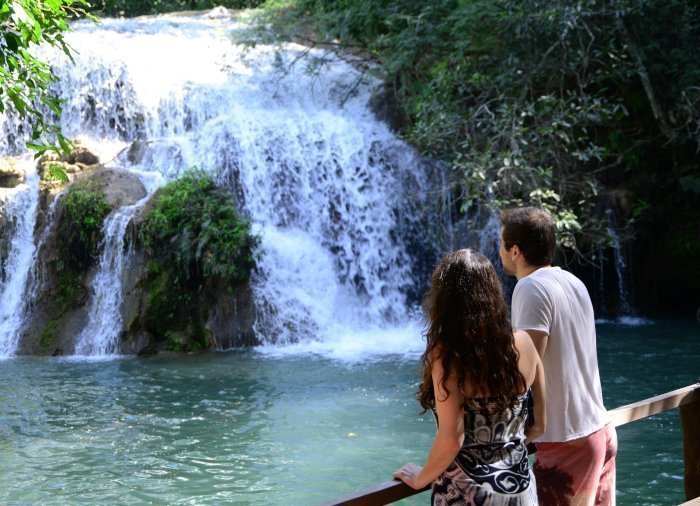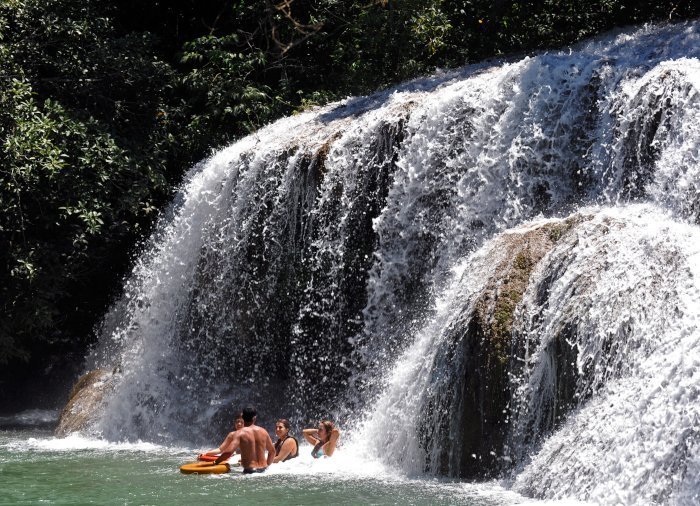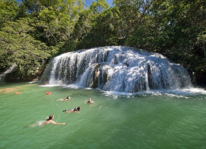 Danach machen Sie einen geführten Spaziergang durch den grünen Wald um den Fluss Rio Mimoso. Sie kommen an 9 verschieden geformten und großen Wasserfällen vorbei. Unterwegs können Sie unter den Wasserfällen sowie in den natürlichen Pools schwimmen, kleine Höhlen erkunden und auf die Serra da Bodoquena mit ihren Wasserfällen und Bergen blicken. Diese bildet das Tal rund um den Fluss Mimoso. Falls Sie Adrenalin lieben, können Sie von einem 6 Meter hohen Sprungturm in ein natürliches Wasserloch springen. An einigen Stellen können Sie auch ein kurzes Bad nehmen und sich entspannen, während Sie die Umgebung genießen.