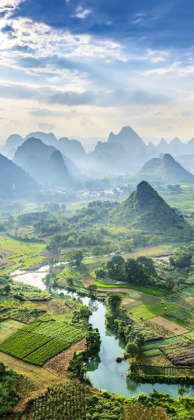 Kultur und Geschichte sind in China äußerst wichtig, aber man darf auch die fantastische Natur nicht vergessen. Daher besuchen Sie natürlich auch die wunderschöne Landschaft von Yangshuo. Hier fließt der Fluss Li an gigantischen Kalksteinbergen und den grünen Reisfeldern der Bauern vorbei – ein wunderschöner Anblick, der auch auf dem 20-Yuan-Schein verewigt worden ist.