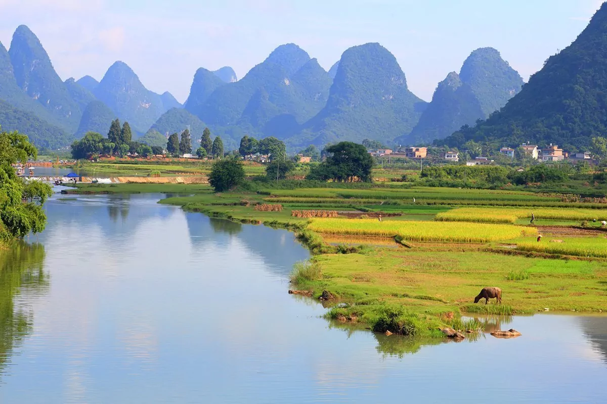 Yangshuo liegt inmitten einer malerischen und atemberaubenden Landschaft. Die Schönheit in Yangshuo und am Fluss Li, der durch die Stadt fließt, ist wirklich beinahe unübertroffen. Es gibt hier moosgrüne Kalksteinberge und Bauern, die fleißig auf ihren Feldern arbeiten. Und natürlich gibt es Ruhe und frische Luft. Es ist nur zu verständlich, dass dieses Gebiet jahrhundertelang Maler und Poeten inspiriert hat. Die Landschaft von Yangshuo wird von den Chinesen sogar so geschätzt, dass der Fluss Li, die Kalksteinberge und die Reisfelder auf dem 20-Yuan-Geldschein abgebildet sind.