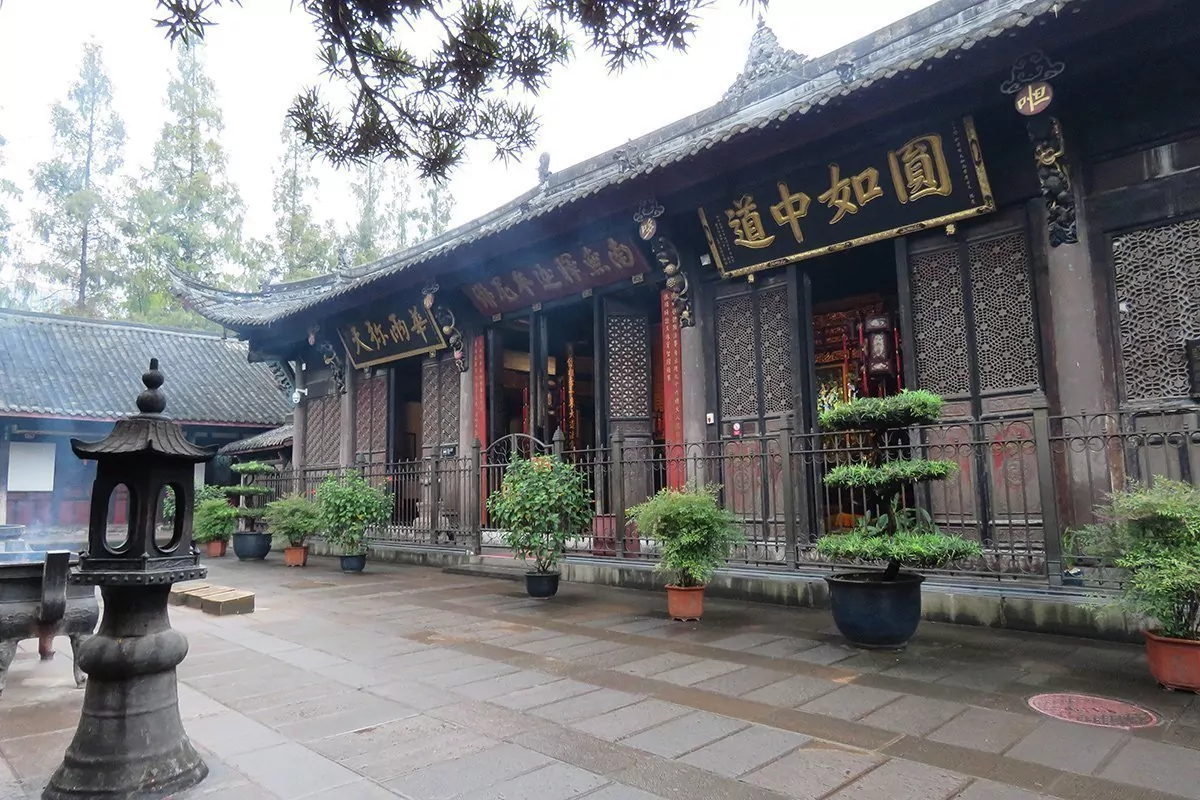 Danach geht es weiter zum Tempel Wenshu. Die Geschichte des Tempels ist interessant und reicht mehr als 1.000 Jahre in die Vergangenheit. Er half dabei, den Buddhismus nach Chengdu zu bringen. Wenshu, der einst Xinxiang hieß, wurde am Ende der Ming-Dynastie von den Bränden des Krieges zerstört. Nur Ruinen blieben zurück, bis ein buddhistischer Mönch im Jahr 1681 der Qin-Dynastie eine kleine Hütte zwischen zwei Bäumen hier baute, in der er leben und seine religiösen Rituale durchführen konnte. Dieser Mönch hieß Cidu. Er wohnte mehrere Jahre in der Hütte und lebte bis zu seinem Tod ein spartanisches Leben. Der Erzählung nach wurde der Mönch Cidu nach seinem Tod eingeäschert. Als der Rauch aufstieg, entstand das Bild von Wenshu. Wenshu ist der chinesische Name für die Weisheitsbodhisattva Manjushri. Das Volk sah Cidu daher als Reinkarnation von Wenshu. Die Renovierung und der Wiederaufbau des Tempels begannen 1697. Fertig war er 1706, wo er auch seinen heutigen Namen erhielt. Der Tempel Wenshu ist heute einer der schönsten und am besten erhaltenen buddhistischen Tempel in China sowie das Zuhause von 80 Mönchen.