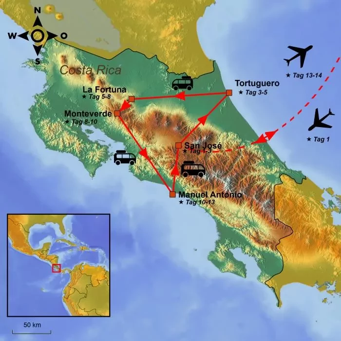 Die Reise beginnt in der Hauptstadt Costa Ricas, San José. Von dort geht es zum grünen Dschungel des Nationalparks Tortuguero. Sie sind umgeben von wunderschöner Natur und einem aufregenden Tierreich. Der gesamte Transport erfolgt hier im Boot auf den vielen Kanälen von Tortuguero.