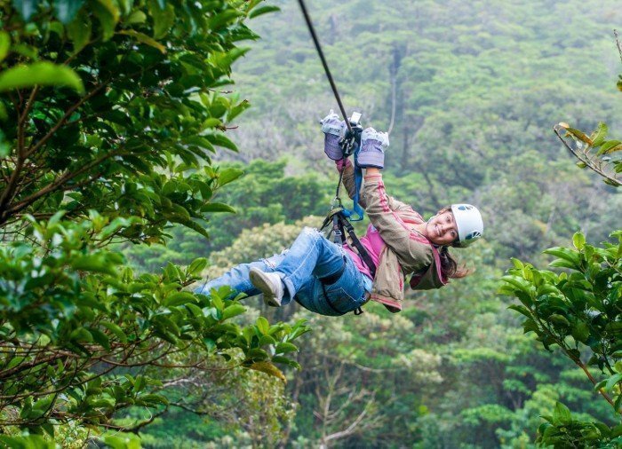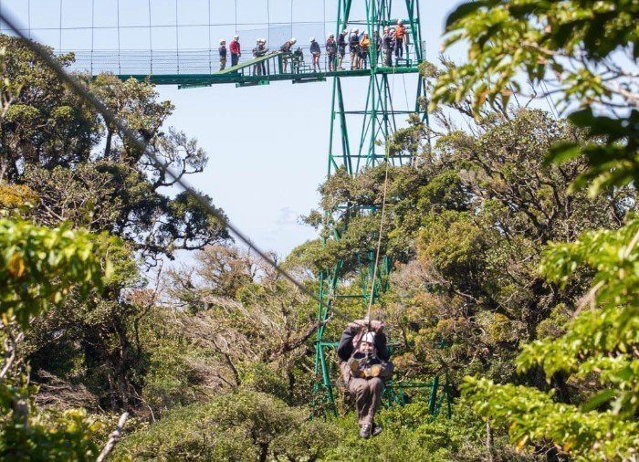 Sie sausen über die Schluchten und grüne Vegetation sowie vielleicht sogar durch die Wolken auf diesen Seilen, welche sicher an Plattformen in den Baumkronen verankert sind. Sie erreichen an den 8 verschiedenen Seilen Geschwindigkeiten von bis zu 70 km/h. Das längste davon ist 750 Meter lang, das höchste 100 Meter über der Erde.