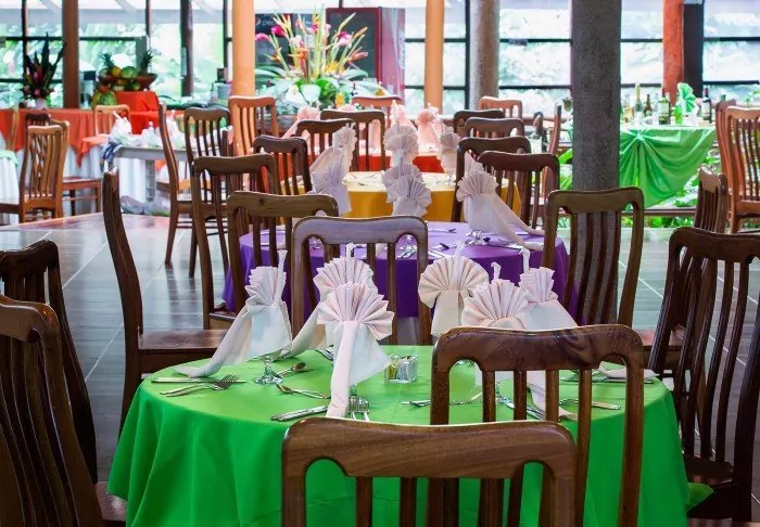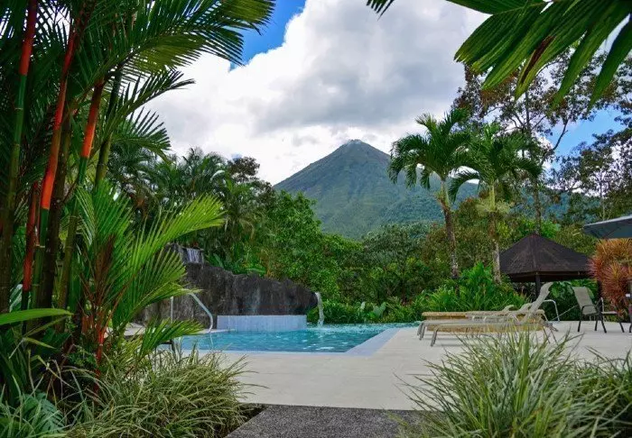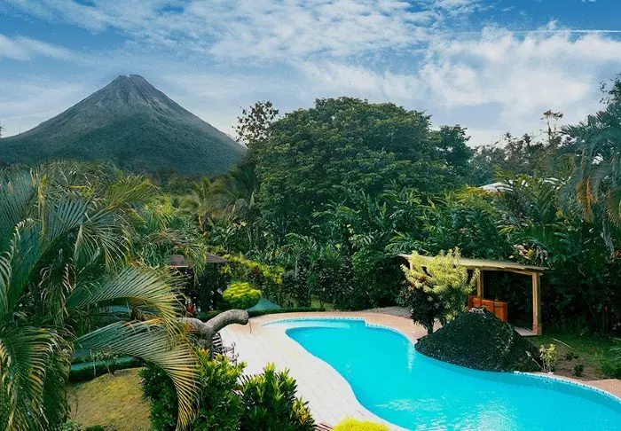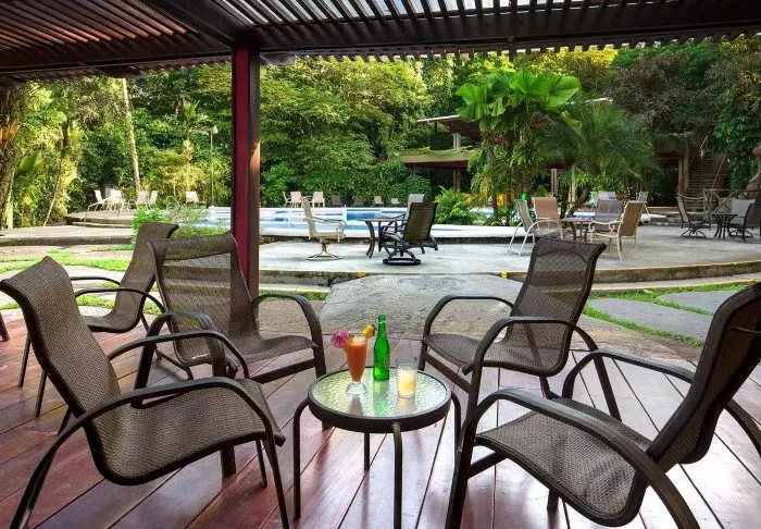 Im überdachten Restaurant des Hotels ist die Aussicht auf die grüne Umgebung ebenfalls herrlich. Hier wird das im Preis inbegriffene Frühstück serviert. Sie können hier außerdem sowohl Mittag- als auch Abendessen bestellen. Mitten im grünen Garten des Hotels befindet sich der Swimmingpool, in dem Sie ein Bad nehmen können oder an dem Sie einfach nur in einem Liegestuhl entspannen können, während Sie die Aussicht auf den beeindruckenden Vulkan Arenal bestaunen.