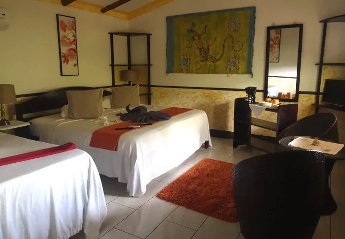 Im Restaurant des Hotels können Sie den wunderschönen tropischen Garten überblicken und die Aussicht genießen, während Ihr Frühstück serviert wird. Im Hotel gibt es zwei Swimmingpools im etwas abgelegeneren Teil des Gartens. Dort können Sie ein erfrischendes Bad nehmen oder sich in einem Liegestuhl entspannen. Mit ein wenig Glück können Sie sogar Affen, Kolibris und Leguane im Garten beobachten.