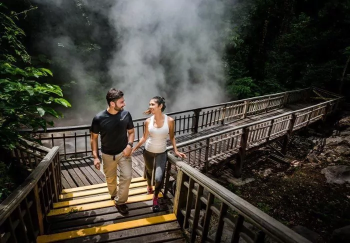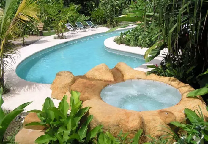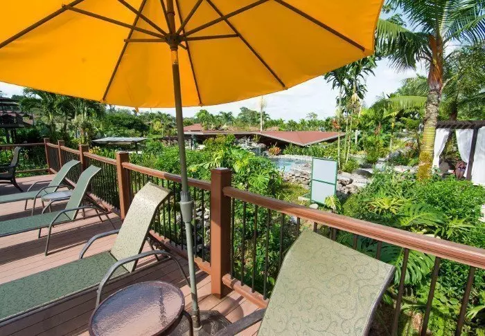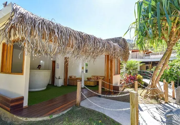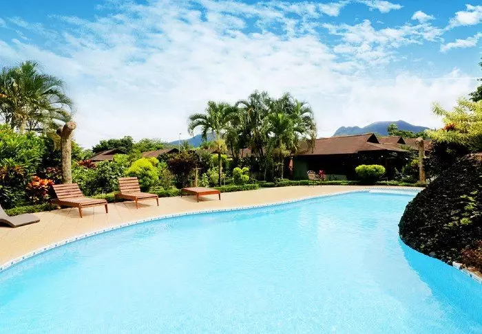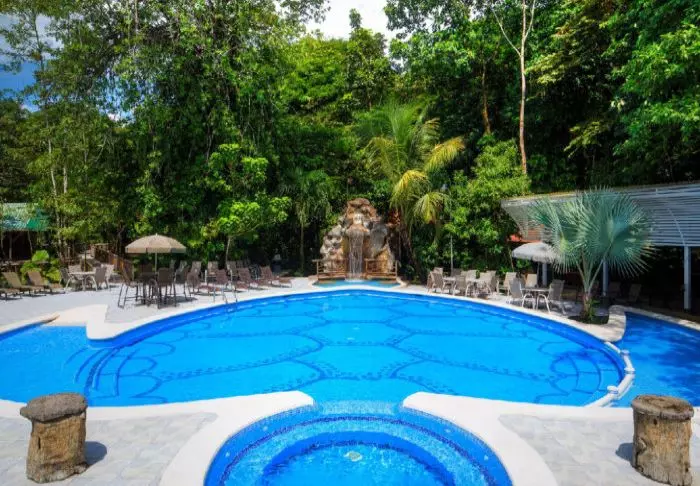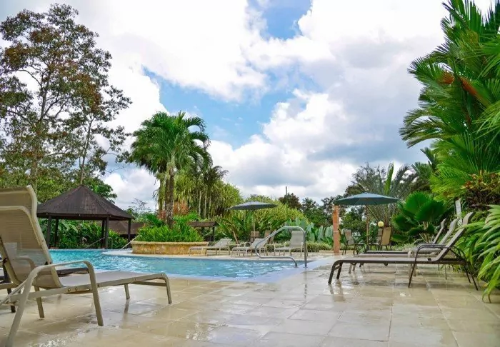 Im attraktiven Poolbereich des Hotels laden die Sonnenliegen zum Verweilen ein. Dort können Sie entspannen, die üppige Vegetation genießen und den Geräuschen des Waldes lauschen.
