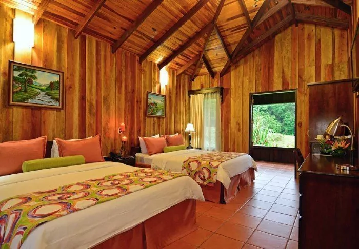 Für alle 60 Zimmer der Lodge holte man sich Inspiration von den ersten Berghütten in Monteverde. Sie sind mit Holzmöbeln und in warmen Farben eingerichtet. Die Hütten sind mit Kabelfernsehen, Telefon, Safe, Kaffeemaschine und einem eigenen Bad/einer eigenen Toilette ausgestattet. Zu den Zimmern gehört eine Gemeinschaftsveranda, auf die Sie sich setzen und in einem der Stühle entspannen können.