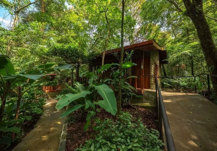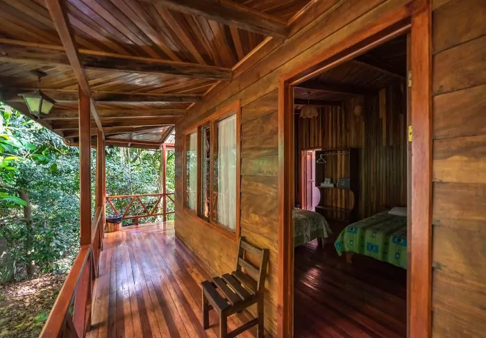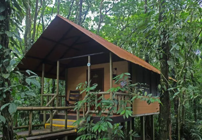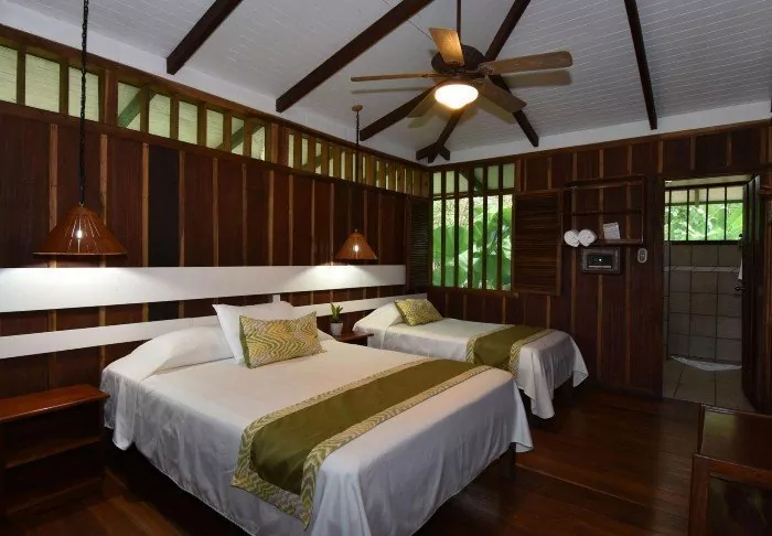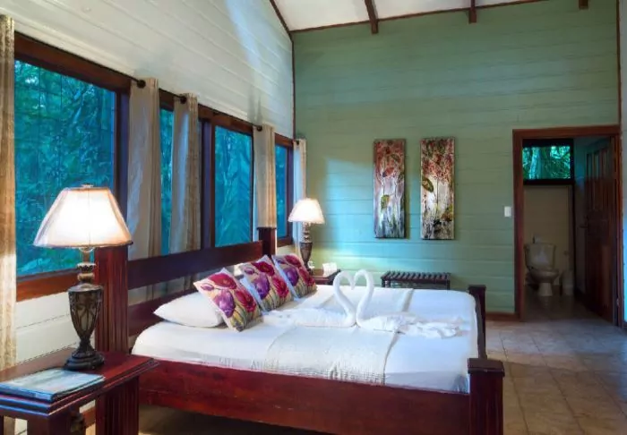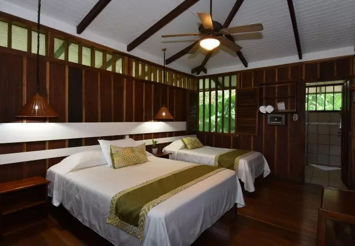 Die Lodge besteht aus Holzhütten in rustikalem Stil, die gut in die natürliche Umgebung passen. Sämtliche Hütten sind mit einem eigenen Badezimmer und einem TV-Gerät ausgestattet. Sie besitzen alle einen eigenen Balkon, auf dem Sie herrlich mit einer hervorragenden Tasse costa-ricanischen Kaffee und einem guten Buch entspannen können, während Sie den Blick auf die raue Natur des Dschungels genießen.