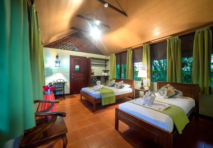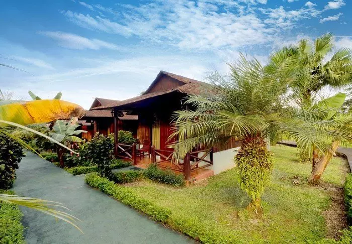Die 10 bezaubernden traditionellen Bungalows der Lodge sind von grünen Pflanzen und Bäumen umgeben, die ein entspanntes tropisches Flair erzeugen. In jedem Bungalow haben bis zu 4 Personen Platz. Die Raumhöhe ist wegen der natürlichen Luftzirkulation hoch. Alle Bungalows der Lodge sind mit Flachbildschirm-TV-Gerät, Mini-Kühlschrank, Safe, Deckenventilator, Moskitonetz über den Betten und einem eigenen Badezimmer mit Föhn ausgestattet. Darüber hinaus verfügt jeder Bungalow auch über einen eigenen Veranda mit Hängematte, in der Sie sich richtig ausstrecken und einfach nur die Umgebung genießen können.