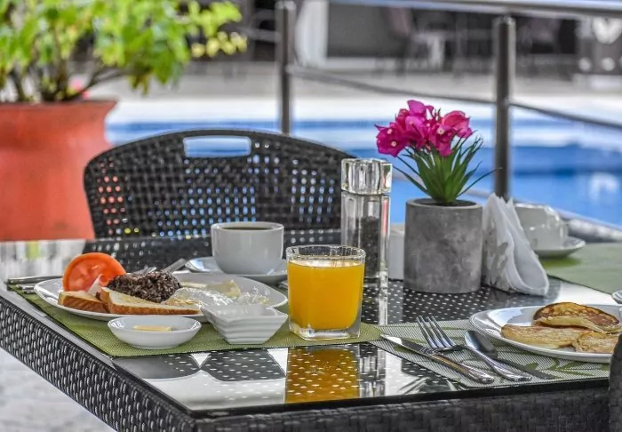 Bei Ihrem Aufenthalt ist das Frühstück mit Kaffee aus regionalen, costa-ricanischen Kaffeebohnen enthalten. Beginnen Sie den Tag mit einem herrlichen Spaziergang im kleinen, tropischen Garten des Hotels, der von Vögeln und Schmetterlingen gut besucht wird. Sie können ausgiebig am Swimmingpool dösen, ein gutes Buch lesen oder ein frisches, tropisches Getränk bestellen. Zudem können Sie im Restaurant des Hotels leichte Gerichte bestellen.
