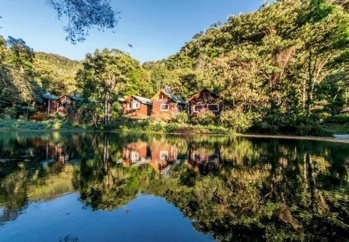 Die Holzhütten der Lodge wurden in rustikalem Stil erbaut und harmonieren somit perfekt mit dieser wunderschönen natürlichen Umgebung. Alle Zimmer sind schlicht, mit Holzmöbeln, TV-Gerät, Safe und eigenem Badezimmer eingerichtet. Es gibt vor Ort gratis WLAN. Der gemütliche Balkon lädt zum Entspannen ein. Genießen Sie die Geräusche der Tiere in der Umgebung und die Aussicht auf den umliegenden Garten und die Berge.