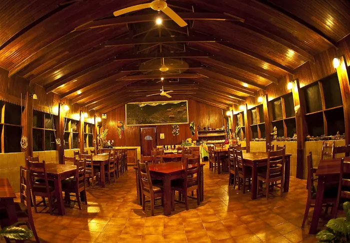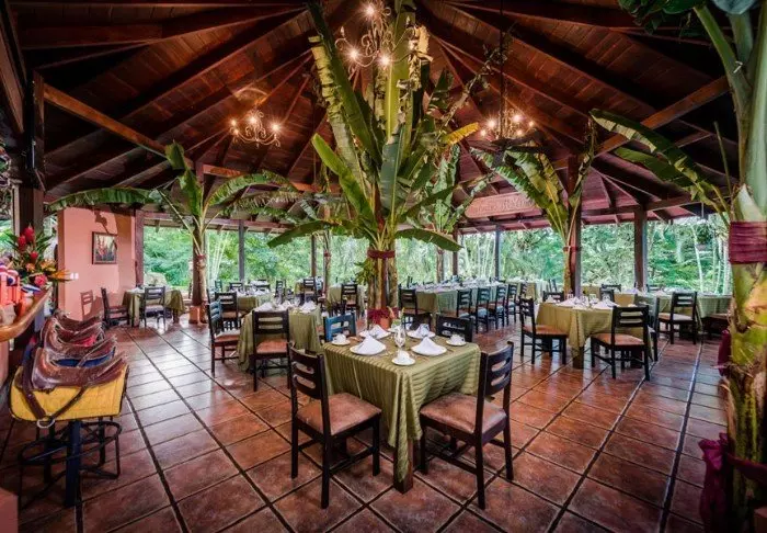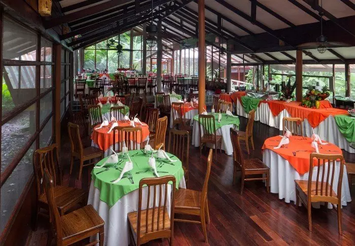 Im Restaurant können Sie sowohl traditionelle costa-ricanische Gerichte als auch europäische Gerichte mit regionalen Zutaten bestellen, während Sie die Aussicht auf die blühende Natur um die Lodge bewundern. Auch das im Preis enthaltene Frühstück wird hier serviert.