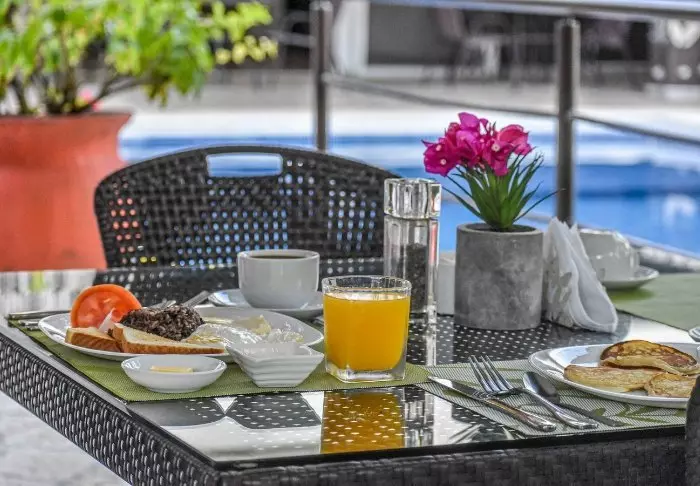 Ihr inkludiertes Frühstück wird im kleinen Restaurant des Hotels serviert, das auch zum Mittag- und Abendessen geöffnet ist (außer im Mai und Juni, wo das Restaurant nur zum Frühstück geöffnet ist).