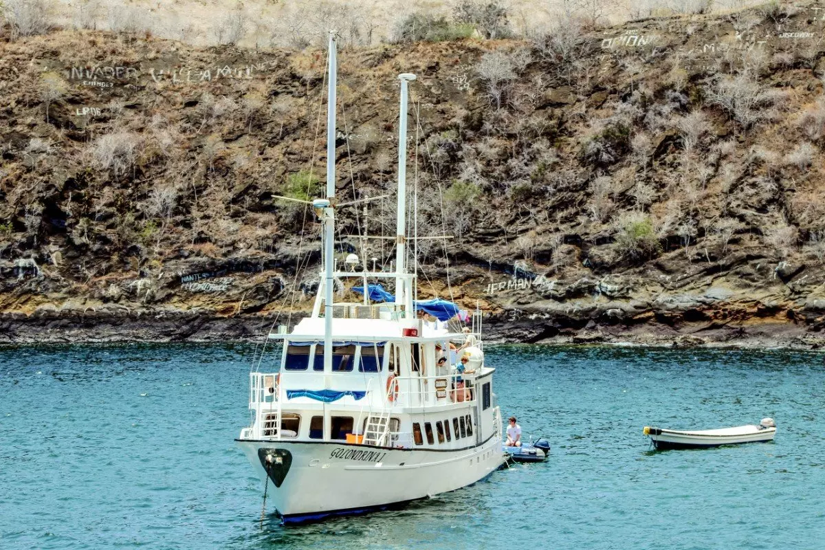 Das Mittagessen wird am Schiff eingenommen. Während Sie essen und sich entspannen, bewegt sich das Schiff langsam weiter zum nächsten Ziel, Isabela. Es wird vor Tagus Cove angehalten, einst ein beliebter Ort für Walfänger und Piraten. Viele von ihnen schrieben die Namen ihrer Schiffe auf die Felswände um die Bucht. Auch heute noch kann man viele Namen auf den Felswänden erkennen.