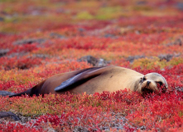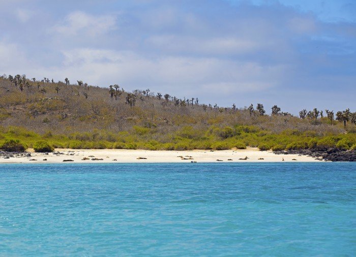 Santa Fé: liegt südöstlich von Santa Cruz. Von Puerto Ayora fahren Sie ca. 1,5 Stunden mit dem Boot zur Insel. Dort werden Sie von einer großen Seelöwenkolonie empfangen, welche sich am weißen Sandstrand aufhält.