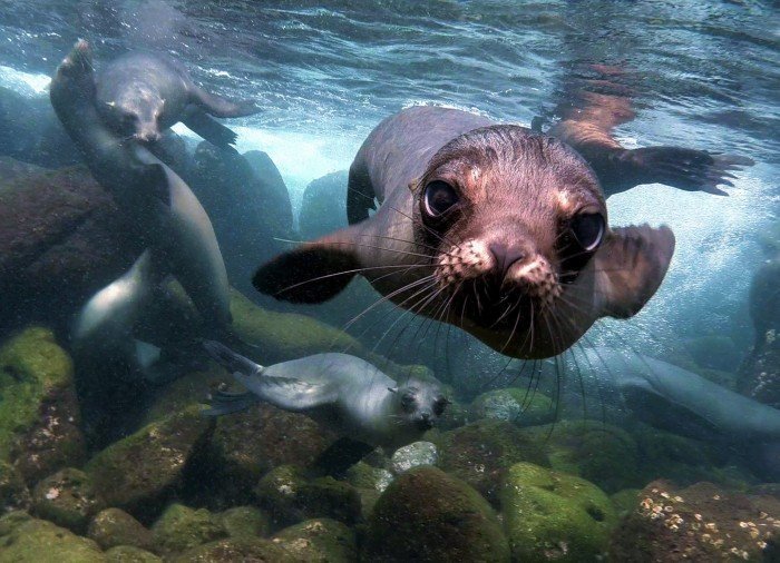Nach dem Mittagessen geht es zurück zum Boot. Es ist Zeit für eine Runde Schnorcheln im klaren Wasser, in dem bunte Fische auf Sie warten. Aber das Schwimmerlebnis mit den neugierigen und verspielten Seelöwen ist die Hauptattraktion des Tages.