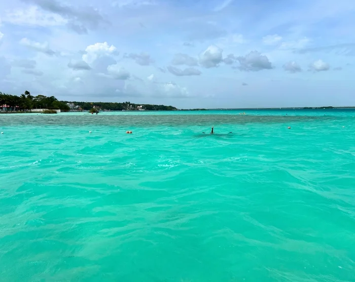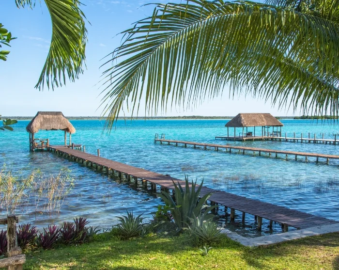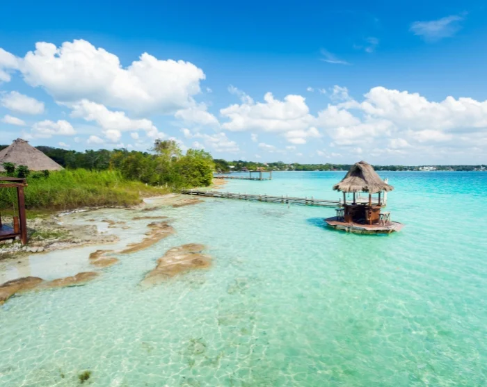 Der nächste Halt ist Bacalar in Mexiko, das für seine friedliche Atmosphäre und die spektakuläre siebenfarbige Lagune bekannt ist, in der Sie baden und den Anblick der Blautöne genießen können.