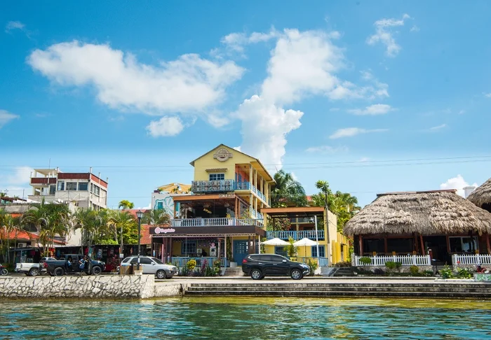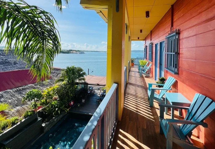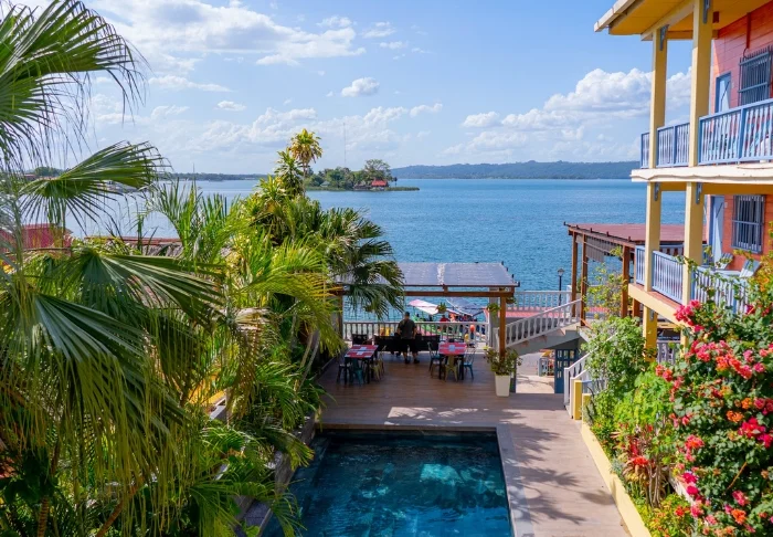 Von diesem farbenfrohen Hotel in unmittelbarer Nähe der Kathedrale der Stadt hat man einen schönen Blick auf den Petén Itzá See.