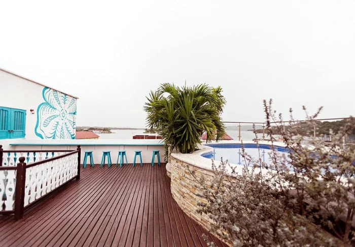 Auf einer der Dachterrassen des Hotels können Sie sich im kleinen Pool erfrischen und sich nach den Erlebnissen des Tages erholen. Die andere Dachterrasse bietet einen gastronomischen Sammelpunkt für alle, die gerne essen und mehrere Bars – unter anderem das Restaurant Achiote und die Bar El Remolino, die später um Mango‘s und Joboo erweitert wurde. Dort werden regionale und internationale Speisen gereicht, die Sie mit Blick über den Lago Petén Itzá und im Lichte der spektakulärsten Sonnenuntergänge der Insel genießen können.
