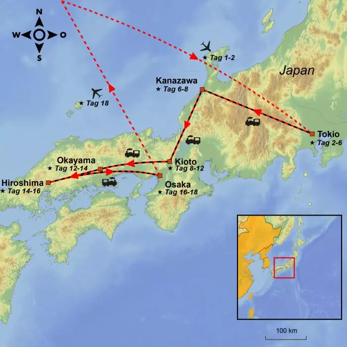 Auf der Reise „Das Beste von Japan“ bieten wir Ihnen bekannte Höhepunkte und einige unbekannte Perlen. Auf Ihrer Reiseroute von Tokio nach Kanazawa, Kaga, Kioto, Okayama, Hiroshima und Osaka werden Sie im Laufe dieser 18 Tage einen wirklich umfangreichen Einblick in die Kultur, Geschichte und Gegenwart Japans erhalten. Sie besuchen Wolkenkratzer, moderne Architektur, alte Kulturstädte, wunderschöne alte Holzburgen, die geschäftigen Geishadistrikte, den Friedenspark in Hiroshima mit der Atombombenkuppel, und Sie erhalten einen Einblick in die Zen-Kultur der japanischen Gärten.