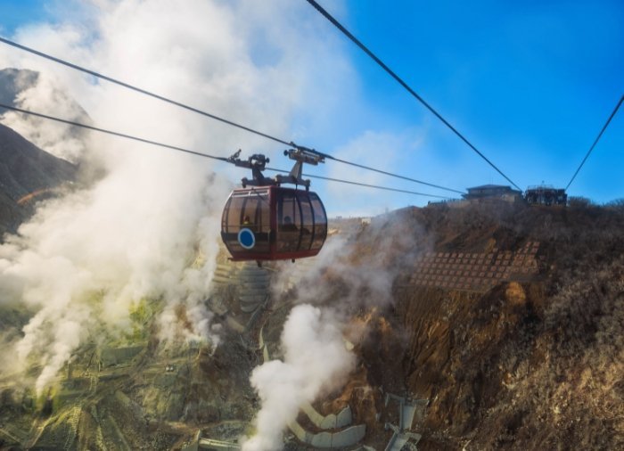 Danach nehmen Sie von der Haltestelle Owakudani die Seilbahn zur Talstation Togendai hinunter. Bei der Fahrt mit dieser längsten Seilbahn Japans, die an allen vier Seiten der Gondel Glasfenster bietet, können Sie die wunderschöne Landschaft so richtig genießen.