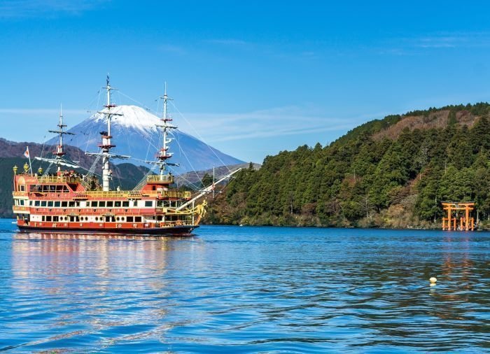 Nach der Ankunft an der Talstation Togendai gehen Sie an Bord eines Schiffes und fahren über den malerischen Ashi-See. Vor 3.000 Jahren entstand durch einen Vulkanausbruch jener Krater, in dem heute der wunderschöne Kratersee liegt. Vom Schiff aus können Sie die herrliche Aussicht auf das Wasser und die umliegenden Berge am See genießen.