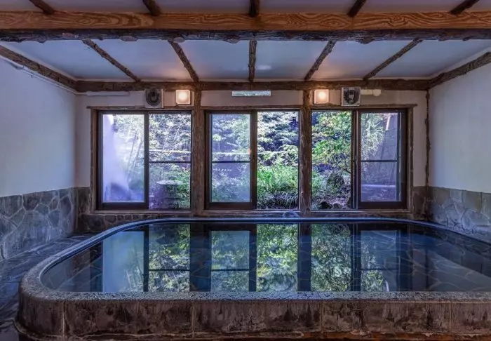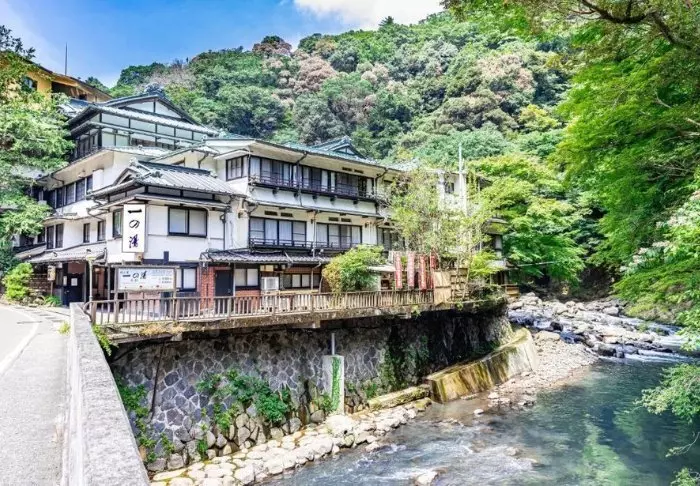 Am Ufer des Flusses Hayakawa in Hakone befindet sich dieses alte Ryokan, Ichinoyu Honkan, aus dem Jahr 1630.
