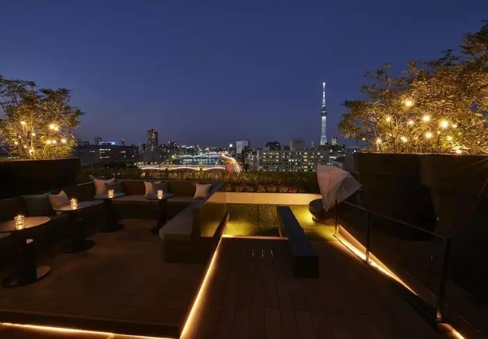Nach einem Tag voller Erlebnisse können Sie bei einem Sonnenuntergangsgetränk auf der Dachterrasse des Hotels mit einem wunderschönen Panoramablick auf den Tokyo Sky Tree und den Sumida-Fluss entspannen.