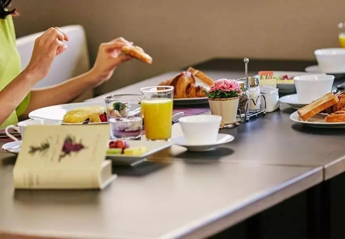 Im Restaurant wird das Frühstück, bestehend aus japanischen und westlichen Gerichten, serviert.