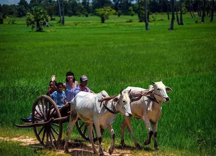 Das Boot fährt weiter zum kleinen Dorf Chansar. Dort wird das Boot gegen einen Ochsenkarren eingetauscht. Eine lustige holprige Fahrt durch die Felder zu einer einheimischen Khmer-Familie, die davon lebt, Besen herzustellen. Sie können beobachten, wie die Besen entstehen und gerne bei der Herstellung eines Exemplars helfen.