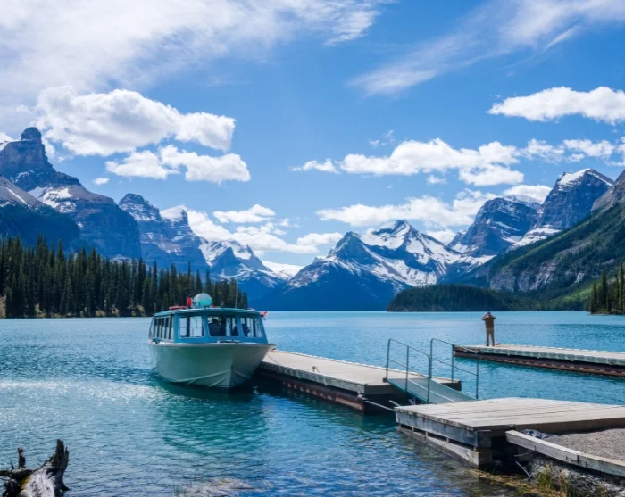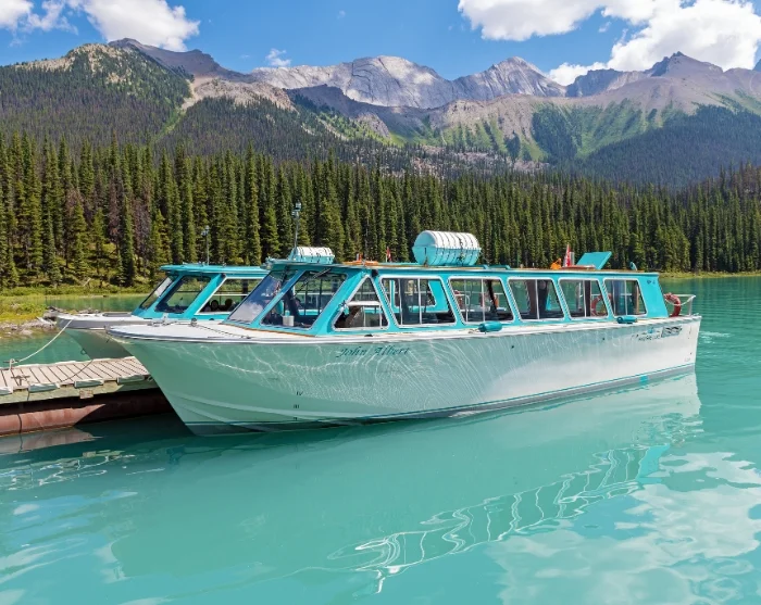 Machen Sie einen schönen Bootsausflug auf dem Maligne Lake, einem der schönsten und sehenswürdigsten Seen in den kanadischen Rocky Mountains.