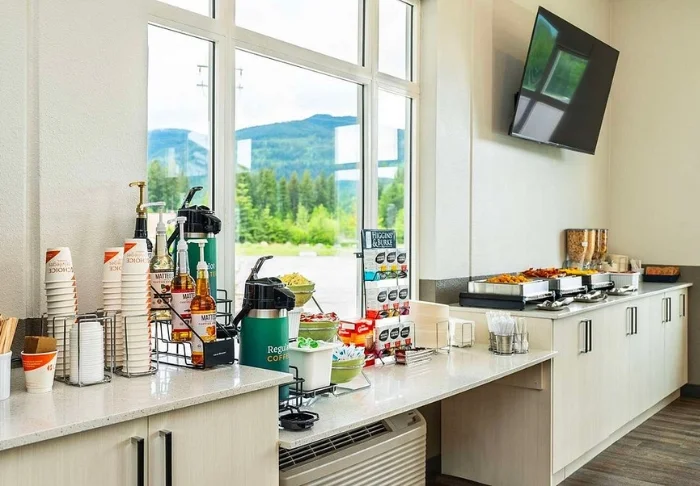 Im Three Valley Lake Chateau gibt es außerdem zwei Restaurants. Im Monashee Dining Room können Sie mit Blick auf den Three Valley Lake frühstücken und mittagessen. In der Cafeteria ist das Angebot mit belegten Broten und Zutaten für das Frühstück einfacher.