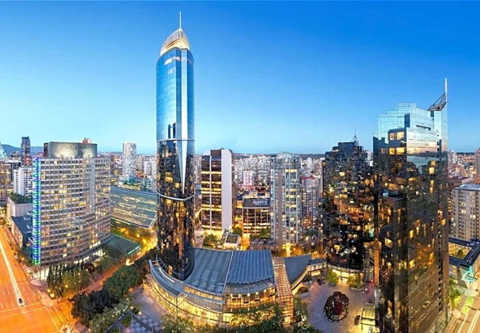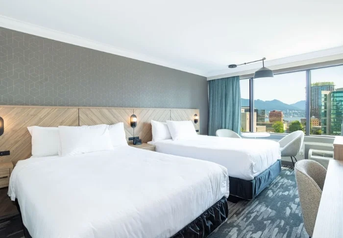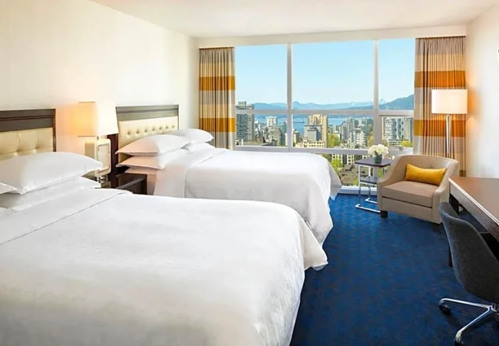 Im Herzen von Vancouver befindet sich das Sheraton Vancouver Wall Centre – ein modernes Hotel, das aus zwei gläsernen Türmen besteht. Von hier aus genießen Sie einen herrlichen Blick auf die Skyline der Stadt, schneebedeckte Berge am Horizont und den Pazifik. Sie erreichen die beliebte Robson Street mit ihren zahlreichen Geschäften, Restaurants und Cafés bequem zu Fuß. Nach einem gemütlichen Spaziergang von 1,5 km gelangen Sie zum Canada Place und zur Hafenpromenade. Wenn Sie Vancouvers grüne Oase, den Stanley Park, besuchen möchten, finden Sie einen Eingang in der Nähe des English Bay Beach, etwa 1,3 km entfernt. In der Umgebung der English Bay gibt es zudem mehrere Fahrradverleihe – ideal, wenn Sie den berühmten Rundweg um den Park mit dem Fahrrad erkunden möchten.