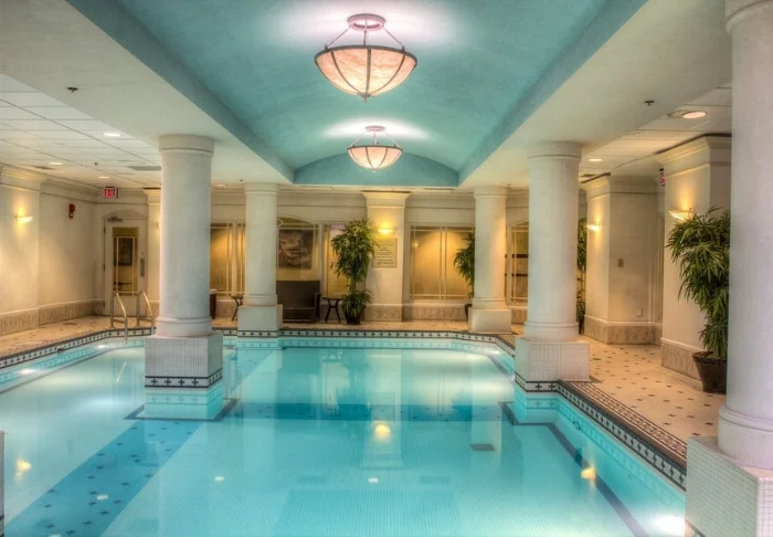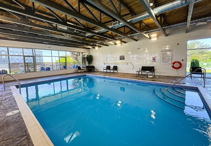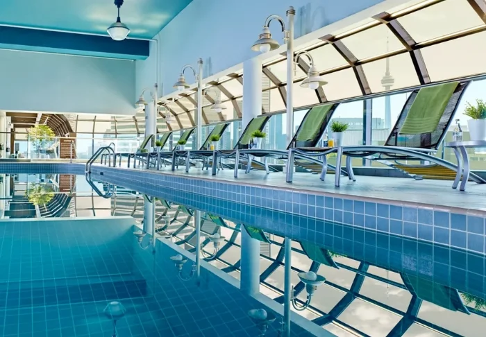 Im obersten Stockwerk des Hotels gibt es ein beheiztes Hallenbad für Erwachsene und eine Sonnenterrasse, wo Sie sich mit einem guten Buch oder bei einem Glas Wein in ruhigem Ambiente entspannen können. Von dort hat man einen herrlichen Blick auf die Dächer und den CN Tower, den ikonischen Aussichtsturm der Stadt, der die Stadt überragt.