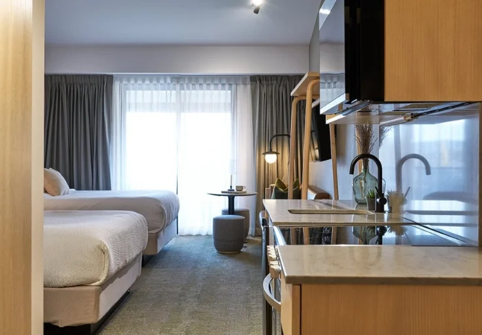 Die Hotelzimmer sind modern, in warmen Farben und mit Naturmaterialien in einem einfachen, funktionellen Stil eingerichtet. Alle sind mit TV, kostenlosem WLAN, Klimatisierung, Kaffeemaschine, Wasserkocher, Mikrowelle, Minibar und eigenem Badezimmer entweder mit Dusche oder Badewanne ausgestattet.