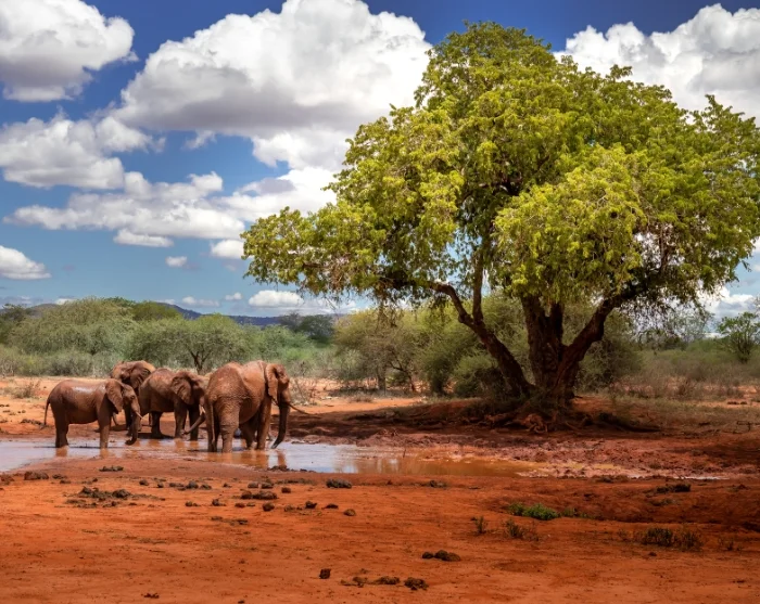 Die roten Elefanten im Park (sie bekommen ihre rote Färbung durch den Boden) sind für viele ein absolutes Highlight. Tatsächlich kann Tsavo die größte Elefantenpopulation in ganz Kenia vorweisen – geschätzt auf etwa 15.000 Tiere.