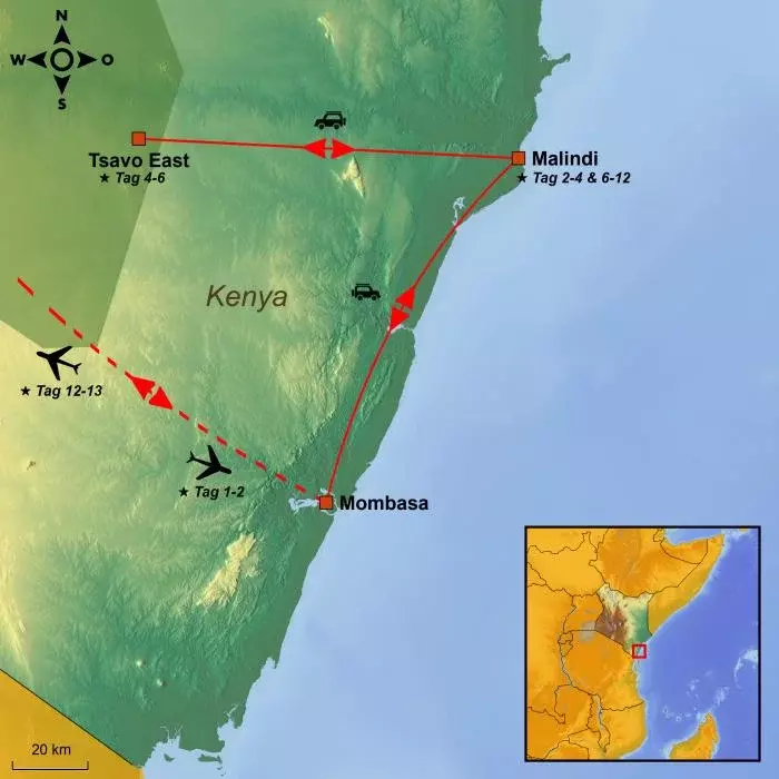 Nach ein paar Tagen an der Küste erwartet Sie eine Safari in den wunderschönen Tsavo Ost Nationalpark. Sie übernachten zwei Nächte in einem herrlichen Safari-Camp direkt vor dem Nationalpark und unternehmen Pirschfahrten im Park. Alle Mahlzeiten und Safaritouren sind in der Reise inbegriffen.