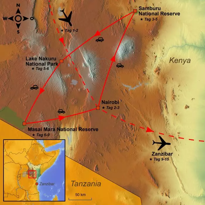 Heute reisen Sie an. Mit dem Flugzeug geht es mit Zwischenlandungen nach Kenia.