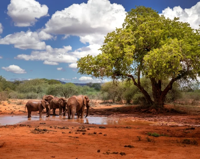 Tsavo besteht eigentlich aus zwei Nationalparks, Tsavo East und Tsavo West, wobei East der größere ist. Die Landschaft ist hier flach und trocken, geprägt von dem roten Boden, der den Elefanten nach einem Schlamm- oder Staubbad eine rötliche Tönung verleiht. Und es gibt viele Elefanten, rund 15.000. Neben Elefanten beherbergt Tsavo East auch Löwen, Büffel, Leoparden, Flusspferde und viele weitere Tiere. Im Park sind zudem 500 Vogelarten verzeichnet.