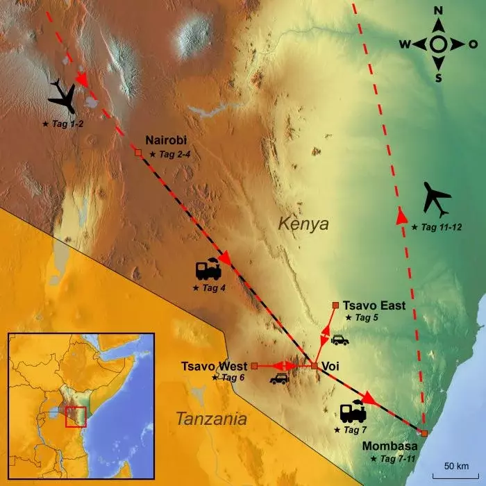 Am Morgen werden Sie von Ihrem Hotel abgeholt und zum Bahnhof von Nairobi gebracht. Von dort nehmen Sie den Zug in die kleine Stadt Voi, die direkt am Eingang zu Kenias größtem Nationalpark, dem Tsavo East, liegt.