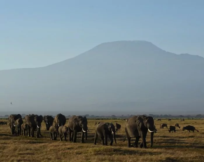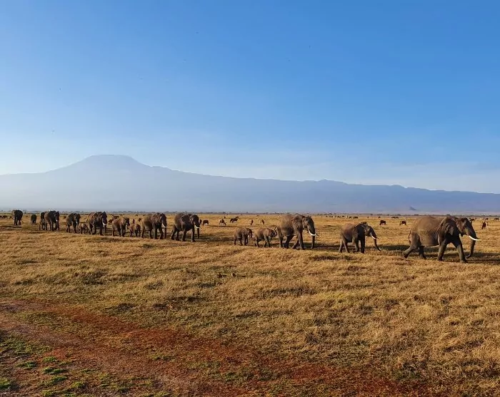 Die Reise geht weiter zum atemberaubenden Amboseli Nationalpark. Amboseli mag einer der kleinsten Nationalparks Kenias sein, aber der Anblick der Elefanten – die aufgrund der trockenen Landschaft leicht staubig sind – mit dem Kilimanjaro im Hintergrund ist sehr bewegend.
