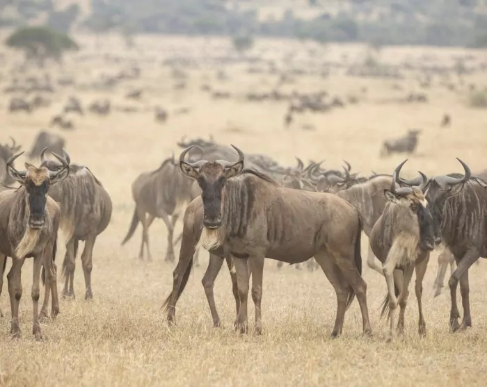 Am Nachmittag verlassen Sie den Krater und fahren in Richtung Serengeti. Eine wunderschöne Fahrt. Die Landschaft wird allmählich immer flacher. Hier und da stehen Zebras und Giraffen, überall gibt es kleine Masai-Dörfer. Manchmal muss das Auto anhalten, wenn ein Masai mit seiner Ziegenherde die Straße überquert. Wenn Sie die Grenze zur Serengeti überschreiten, sind die Masai verschwunden. Stattdessen kommen immer mehr Tiere. Gnu- und Zebraherden soweit das Auge reicht. Viele große Riesentrappen sind zu sehen. Dabei handelt es sich um den größten fliegenden Vogel Afrikas. Häufig sieht man sie in der Nähe der Gnus. Dort fressen sie die kleinen Insekten, welche den Gnus das Leben schwer machen.